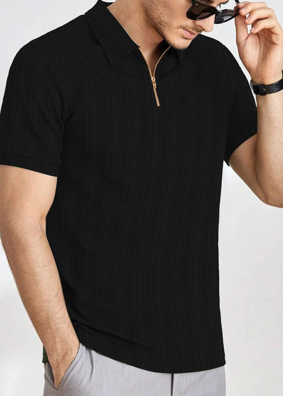 Men’s Ribbed Zip-Neck Polo T-Shirt – Solid Black