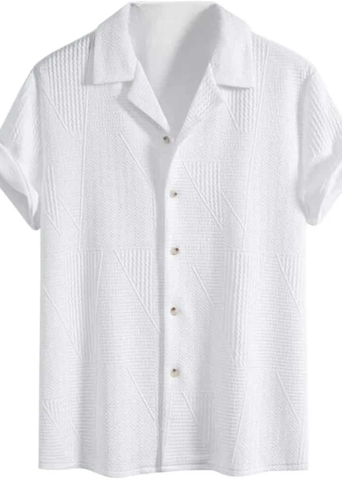 Elevate your summer style with this men’s white textured Cuban collar shirt. Designed with a relaxed fit and crafted from lightweight, breathable fabric, this shirt offers all-day comfort with a clean, modern look. The subtle textured pattern adds sophistication, while the short sleeves and open collar make it perfect for warm weather. Ideal for casual outings, vacations, beachwear, and weekend styling.